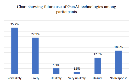 There are instructors who do not allow the use of generative AI and state that in the syllabus or learning plan. Should instructors embrace AI literacy and create an awareness that fosters transparency? Tyton Partners did a survey “If your instructor or institution prohibits the use of generative AI writing tools, how likely are you to still use something like ChatGPT?”.
